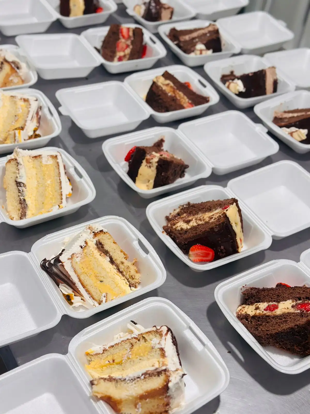 Se liga na diversidade de sabores: Pudim de Doce de Leite, Pudim de Leite Ninho, Morango com Ninho e Suspiro, Prestígio, Ferrero Rochero, Maracujá Trufado, Abacaxi com Leite Ninho e a grande campeã: 3 Amores (chocolate 50% + brigadeiro branco). E o melhor: cada fatia monstra sai por R$ 25.